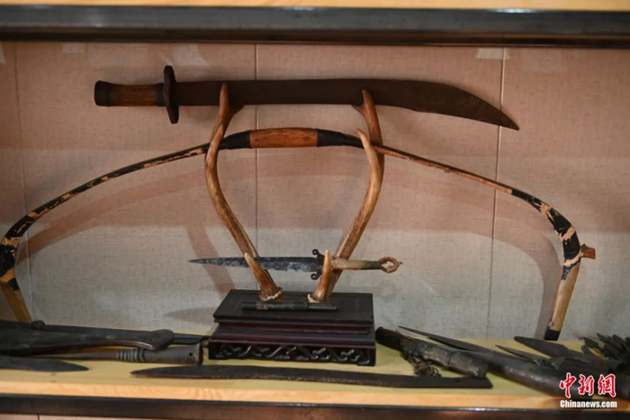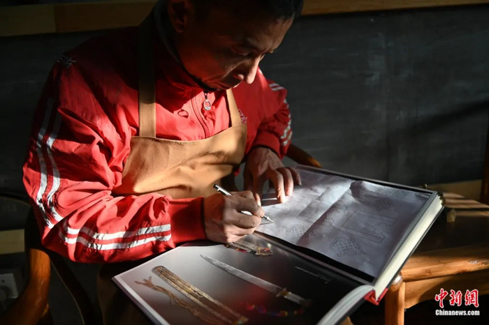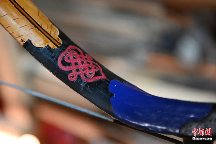 弓箭制作不仅需要制作者掌握木工、铁艺等方面的技能,还需要制作者对绘画、装饰等艺术方面的技艺有所研究。弓箭是锡伯族的文化符号,为了美观也为了图个好寓意,锡伯族人会在弓箭上装饰各种各样表达美好愿景的民族图腾。“喜利妈妈”是锡伯族人的吉祥物,寓意保佑子孙延续和家宅平安。鄂建烨介绍,锡伯族家庭有男孩诞生时,就会在喜利妈妈上悬挂一把小弓箭,希望孩子长大后能够成为一名勇敢的射手。