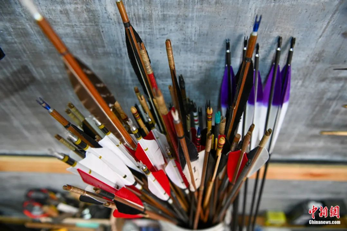 鄂建烨介绍,过去在制作箭羽时人们通常会采用雕翎或大雁的羽毛,但是现在它们都已成为国家保护动物,不能取用,现在他通常采用材质较硬可以反复使用的火鸡羽毛。