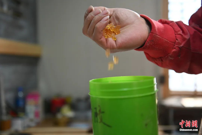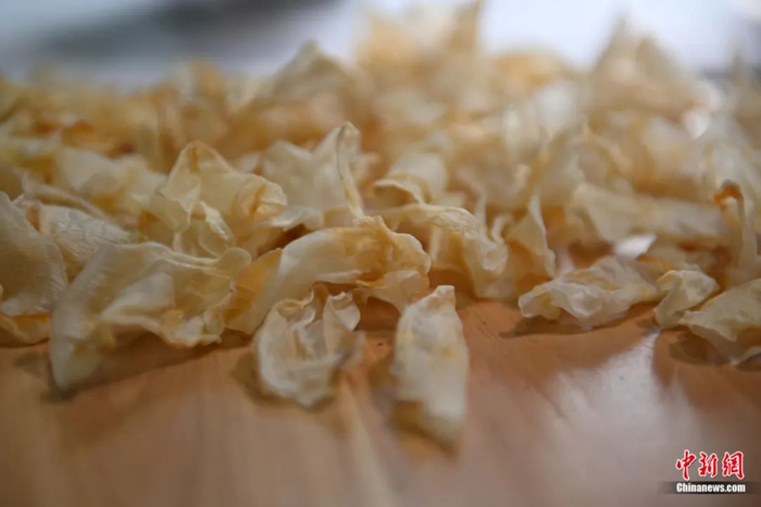 制作弓箭专用的胶——鱼鳔胶,上等的鱼鳔胶会选取特别丰厚的鱼鳔,并且越大越好。