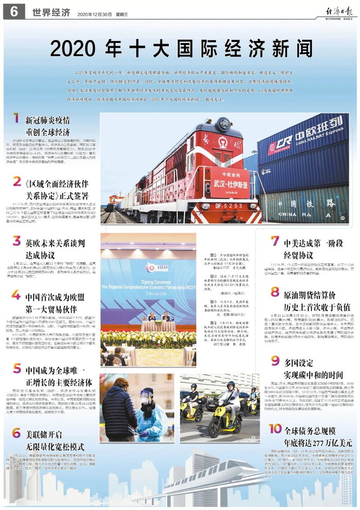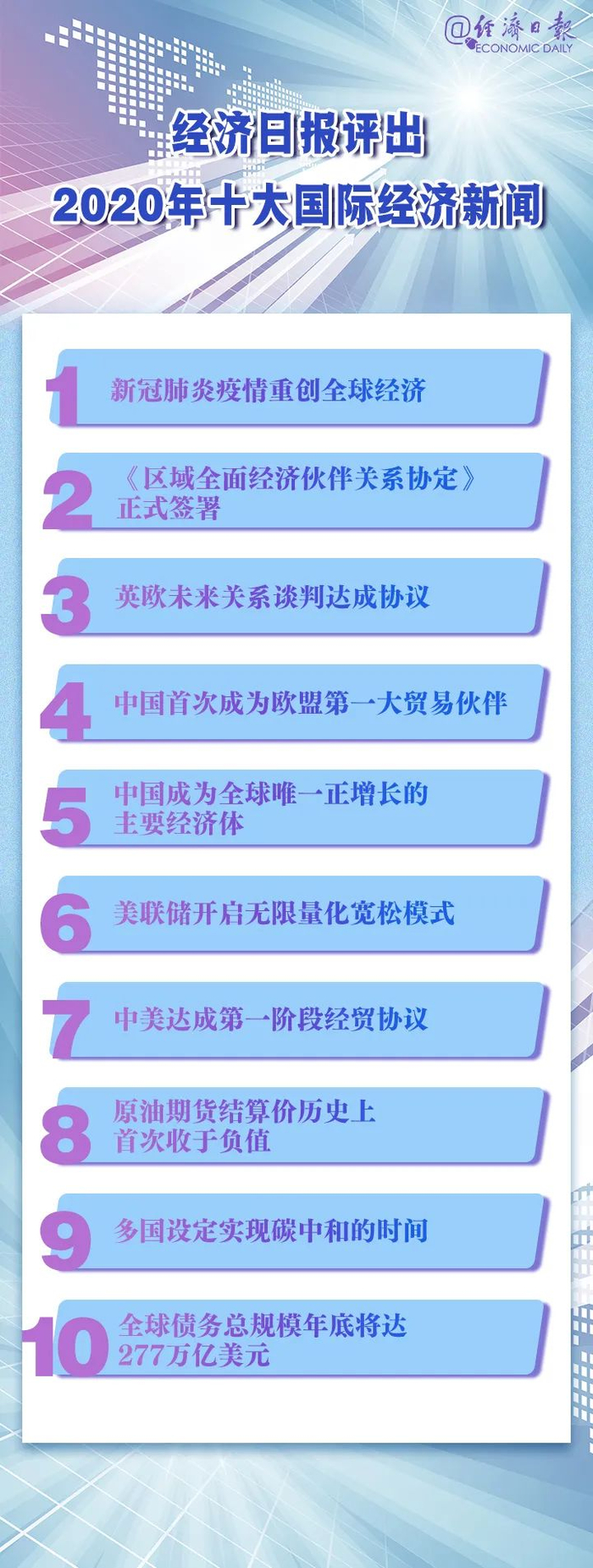 2020年是极不平凡的一年。新冠肺炎疫情肆虐全球,世界经济陷入严重衰退,国际格局加速演变,单边主义、保护主义上升,全球产业链、供应链受到冲击。同时,全球努力稳定和恢复经济的各项举措效果初显,世界经济出现缓慢回升。为使广大读者及社会各界了解今年世界经济发生的重大变化及其特点,更好地把握当前和今后的走势,以及我国外部整体经济环境现状,经济日报及中国经济网推出“2020年十大国际经济新闻”,一起来看↓↓