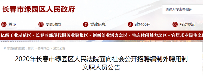 28日,长春市绿园区官网发布招聘公告,为加强绿园区司法工作建设,切实解决司法体制改革过程中人员力量不足的现状,绿园区人民法院现面向社会公开招聘12名编制外聘用制文职人员。