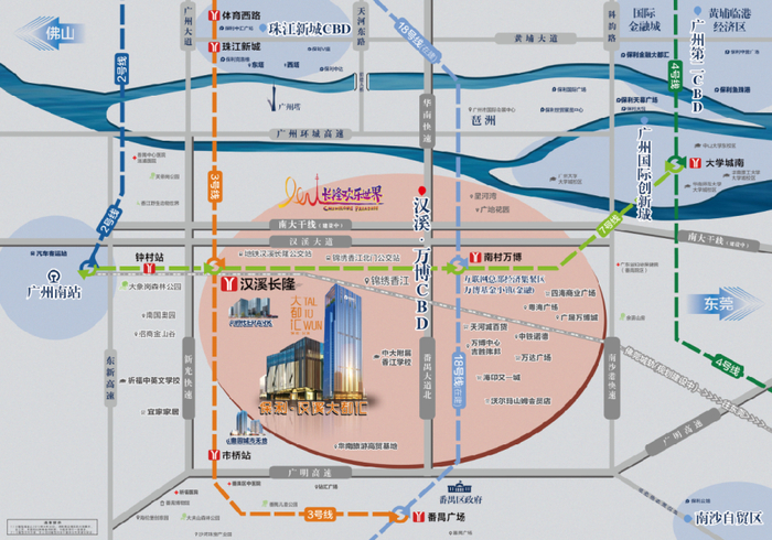 项目位于汉溪大道与新光快速交汇处,毗邻新光快速出入口,出门即上高速。北临汉溪大道,南临广明高速,周边还有华南快速、南沙港快速、南大干线、番禺大道等多维的交通路网。大都汇距离地铁 3 号线、7 号线的交汇站——汉溪长隆站,仅步行 5 分钟即可到达,是双地铁上盖物业。可实现4站瞬达广州南站,5站直达客村,7站直达珠江新城,畅达海珠、天河等主城商务圈,享受快捷便利的城芯生活。同时,佛莞城际将在这里设立长隆站,未来前往佛山和东莞也非常便利。