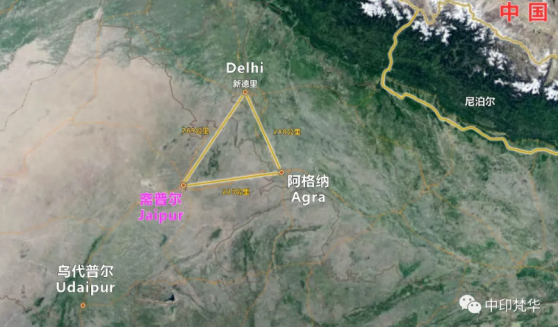 (德里-阿格拉-斋普尔“金三角旅游路线”地理示意图)