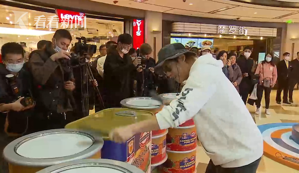 闪烁的霓虹灯管、琳琅满目的各色罐头、经典的马口铁包装,都是浓浓的回忆杀。而敲击着梅菜扣肉罐头鼓,弹拨着午餐肉火腿罐头吉他,原汁原味的老上海风味,华丽转身,瞬间变身潮爆的“罐头音乐厂”,吸引了不少路人纷纷驻足欣赏。
