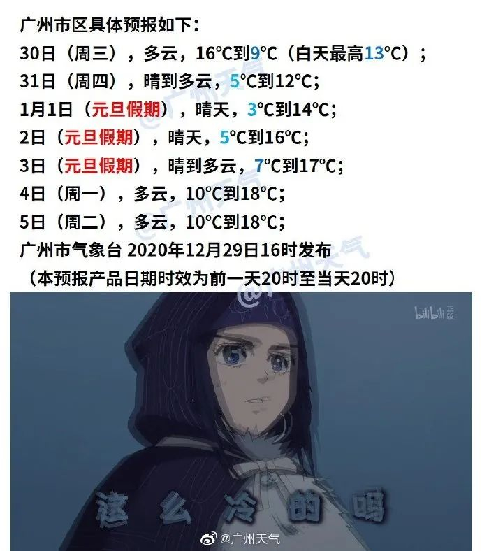 29日傍晚起寒潮自北向南影响广州,30-31日气温急降10℃至12℃,陆地偏北风增大到6-7级,港区8-9级。全市气温急剧下降至今年以来最低值,过程最低气温出现在2021年1月1日(元旦)早晨,最低气温将降至3℃。本次过程市区最低气温出现在元旦早晨仅有3℃,其中北部山区可低至-3℃,局部地区有霜(冰)冻,大家要注意做好防寒保暖工作。