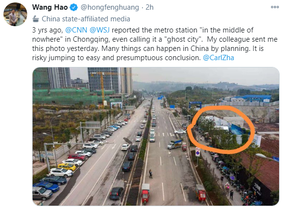 网友@hongfenghuang直言,3年前,CNN、《华尔街日报》报道称重庆的地铁站建在“无人之地”,甚至称其为“鬼城”。昨天我的同事给我发了下面这张照片。中国按照规划办成了不少大事。(西方媒体)对中国发生的事仓促下结论是有风险的。
