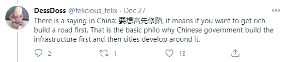 “中国有句谚语:要想富先修路,这意味着如果你想致富,那就先修一条路。这就是中国政府首先建设基础设施,然后围绕城市发展的基本理念。”