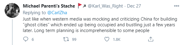 “就像西方媒体嘲笑和批评中国‘鬼城’一样,短短几年时间,这些地方就变得热闹了起来。长远计划对于某些人而言,是难以理解的。”