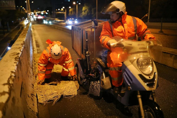▲ 泸定路桥保洁人员深夜抗寒