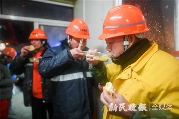 时间一分一秒走过,温度也在一点一点下降。半个多小时后,工地食堂为加班的建设者们送来了羊肉汤和饼。一位工人站在雪中,喝着汤嘀咕道:“羊肉汤,好喝又暖身。”