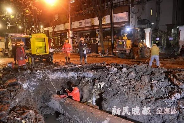 正在现场的黄浦供水管理所副所长汪巍介绍,昨晚9时爆管后就启动紧急预案,市水务局、市供水处等相关方面负责人迅速赶到了现场。现场,抢修人员及时关闭附近进水阀门、开启移动泵车排水的同时,也根据市民反映的情况和水压监测情况,迅速锁定了爆管位置,之后,随着地下管线情况快速查清,挖机就开始破路作业。