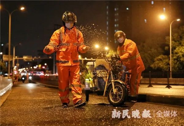 林建军和同事焦明武将融雪剂洒向地面,一捧又一捧,仔细均匀地撒在非机动车道正中央。余贺凯和唐威淘则紧跟在他们身后,将一只只草编袋铺在靠近上街沿的路边,边铺边细心地用脚踩实排紧。而这支队伍的最前头,则是一辆道路清扫车和两位手持扫把的清扫工。到了1点多,气温下降得很快,地面温度更低,新民晚报记者脚底已如同踩进冰窟,师傅们却还在紧张地忙碌着。