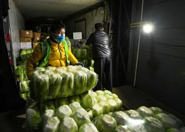 一口气抱起近30公斤一袋的大白菜,再慢慢放在仓板上,刘敏用液压车把一板又一板的蔬果推进收货区,终于在0:30完成了这家店的配送。无暇赏雪,下一站是新村路。