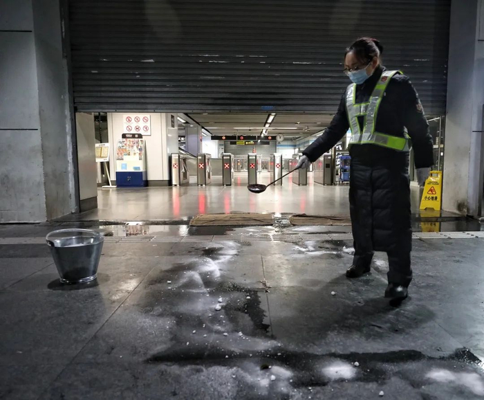 穿好反光背心、裹了一层厚厚羽绒服的的吴陆梅是当班的车站设备值班员,为确保第二天地铁站能正常进出不结冰,她和同事们在出入口台阶处和无障碍通道处抛洒盐粒,舀起一勺就用力向远处的地面积水抛洒,既快速又均匀。