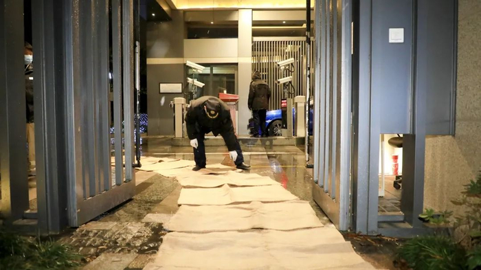 ▲ 浦东新区尚海郦景小区保安在铺设防滑的麻袋