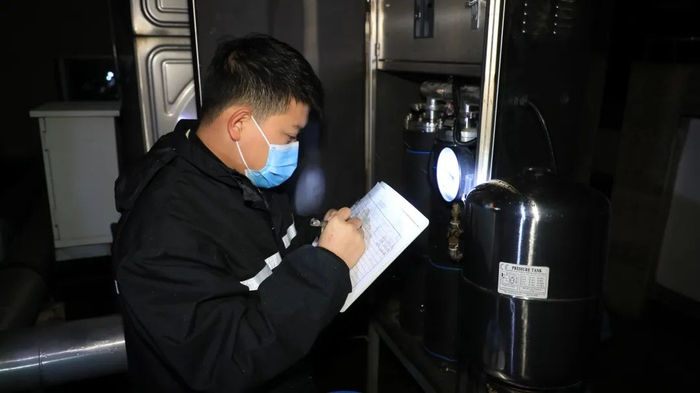 打开水箱增压泵的机箱门,龙杨拧了拧放气阀,有水珠冒出;摸一摸泵体和外层海绵,没有温差;用手电筒照了照水箱压力表,指针定格在0.2兆帕,正常运作区间内。位于水箱另一侧的电动阀已经提前被包裹了两层厚厚的保温棉,龙杨伸出食指,按了按电动阀的接口处,手指干燥。龙杨解释道:“这说明电动阀接口处没有漏水、没有积水,冻结的可能性不大。”几项检查任务完成后,龙杨在检查表上打了一个大大的勾,准备去下一幢居民楼的天台。小区有33幢居民楼,33个水箱。夜间温差大,他们特意增加防冻巡查频次,上半夜一次,下半夜一次。