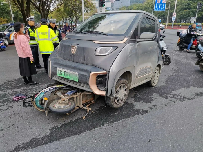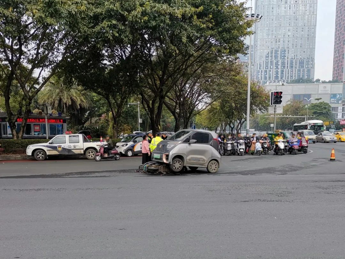 2020年12月28日11时许,柳州市公安局交警支队城中大队接到报警,桂中大道与文昌路路口,一辆小型新能源汽车右转时与一辆直行的电动车相撞,电动车驾驶人被压在小型新能源汽车车轮底下,无法动弹。事故共造成两车不同程度损坏,电动车驾驶人受伤。