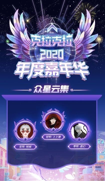 本次嘉年华,克拉克拉首次开通“众星云集“赛道,鼓励平台的主播和用户产出优质的视频内容参与活动。赛道共开通两周的时间,共有上万名用户参与发帖,近两百名主播发布近3000个参赛视频,累计应援超过300万。最终,“众星云集”赛道冠军由上上谦斩获,亚军和季军分别由主播铭城、虚幻获得。