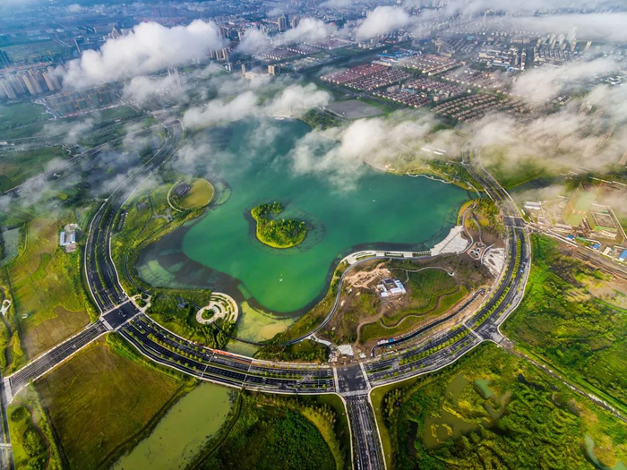 绿树、碧水相互映衬的秀洲天鹅湖未来科学城,嘉兴市委宣传部供图