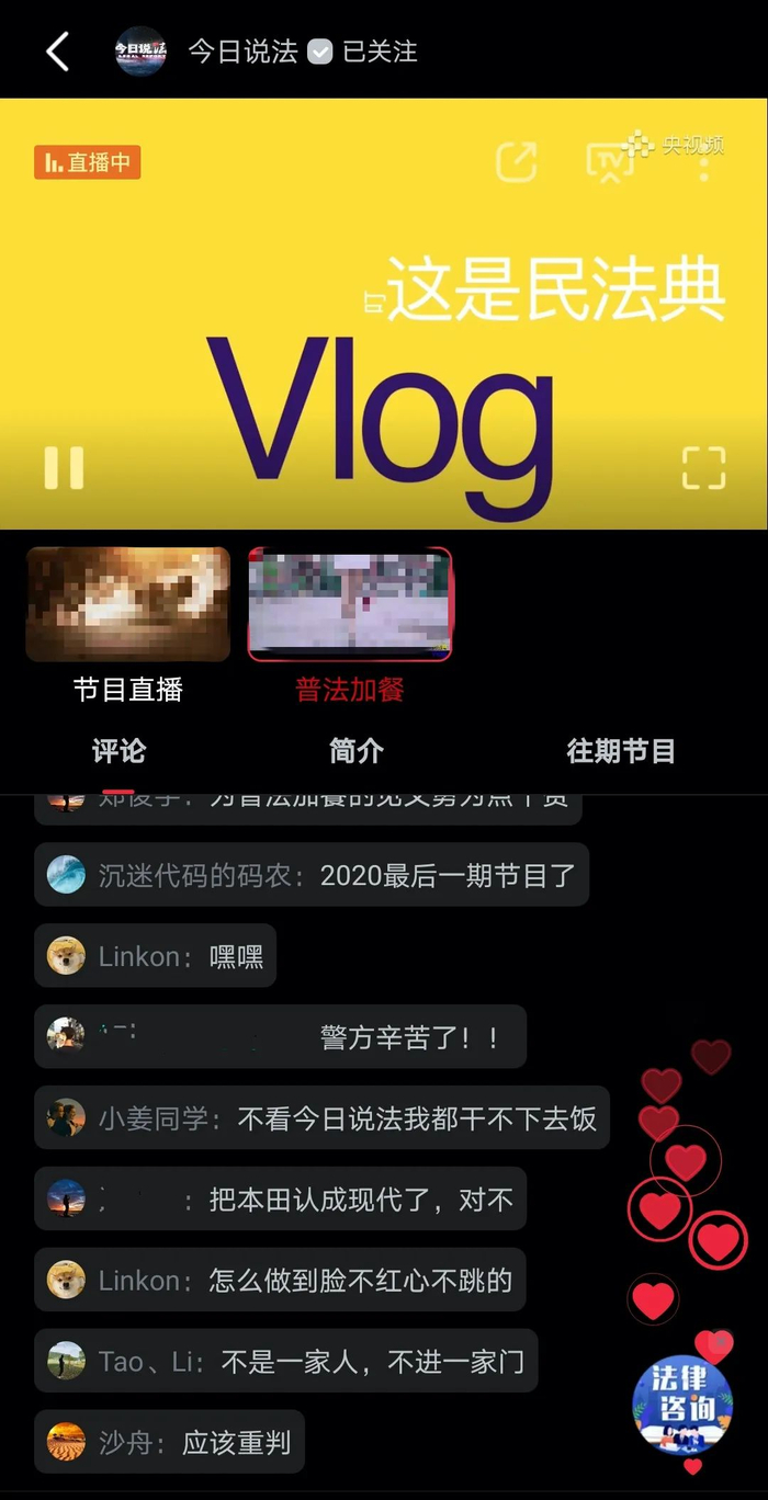 最后,我们还提供午餐持久储存服务,如果错过了直播,闲暇时打开央视频看上两集节目来个“法律下午茶”或者“法律宵夜”也是不错的选择!