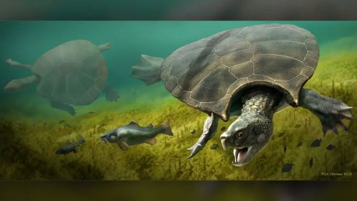 这种古老的海龟属于一种现在已经灭绝的物种——地纹骇龟,其在中新世时期(1200-500 万年前)生活在南美北部。这个“忍者神龟”重约1145公斤,几乎其“近亲”亚马逊大头侧颈龟的100倍,是现存最大的海龟海洋革龟的2倍大。