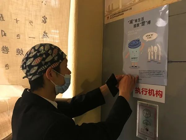 在一家名叫“渔上”的日料店内,工作人员正在张贴“限塑”宣传单
