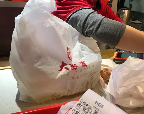大富贵外卖柜台上,点餐的外卖都用可降解塑料袋打包