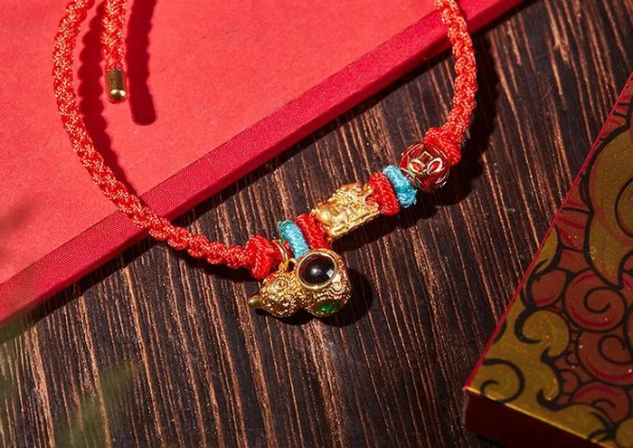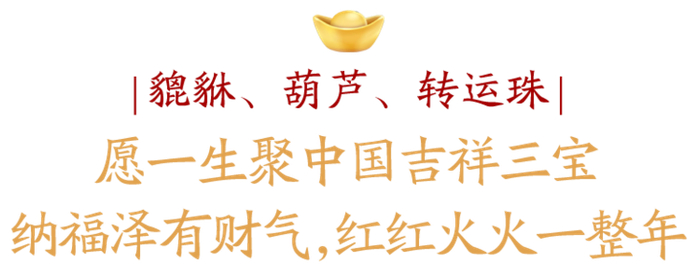 细看这红绳,其上竟串了中国传统吉祥三宝——貔貅、葫芦、转运珠,为自身的好福气锦上添花,加了不少好财运。