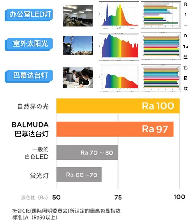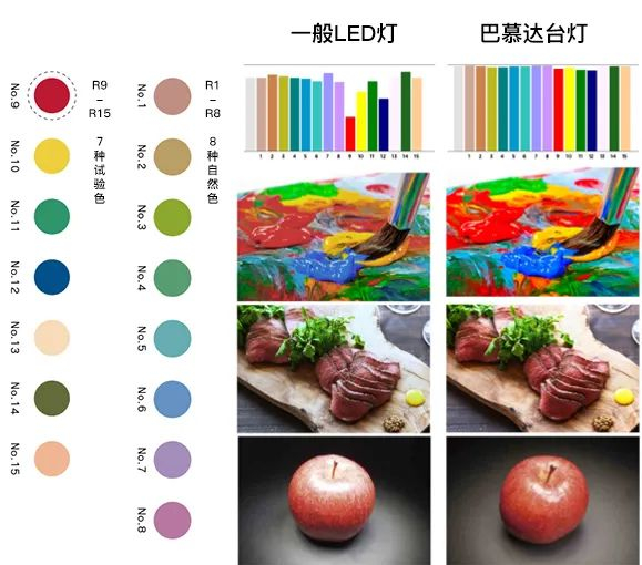 包括R1-R8的8种自然色,以及R9-R15的7种试验色下(普通台灯只测试R1-R8),巴慕达的显色指数高达97,色彩还原水平直逼太阳光。