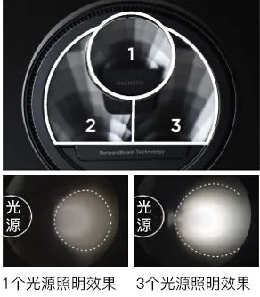 使用3个光源将照明区域拉近一个圆圈,可以均匀照亮更宽广的区域。