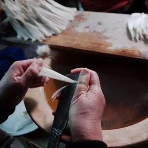 一张矮凳、一副眼镜、一把择笔刀……湖笔大师杨松源左手执笔头,右手拿择笔刀。笔头的毛刷被一层层快速翻起,不到几秒钟就剔除了不合格的杂毛。