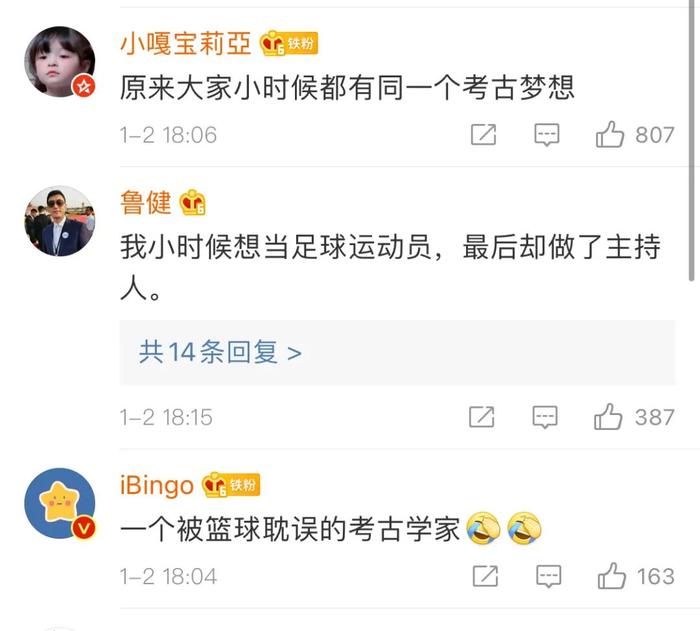 “我小时候还想当科学家,被现实打败了”“我小时候梦想有很多,有两项是作家以及画家”“原来大家小时候都有一个考古的梦想”……