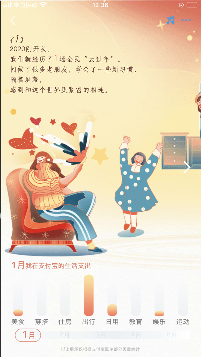 打开后,每个月你在支付宝的生活支出,会显示你把钱是花在哪里,美食、穿搭、住房、出行、日用、教育、娱乐以及运动等方面,最后是年度总账单。