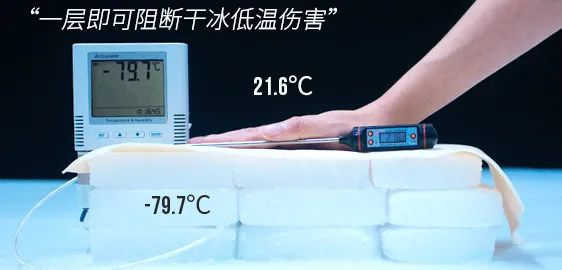 将薄薄的一层气凝胶铺在零下79.7℃的干冰上,温度计贴上去后能清晰的看见,气凝胶的上面还能维持21.6℃的温度。