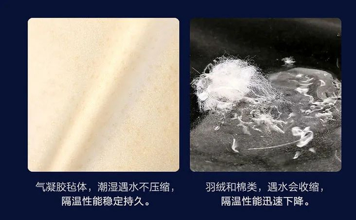 而且跟那些棉啊什么的比,气凝胶还不会遇水不会收缩,在雨雪天气,保温性也不减,咱也可以放心踏雪。
