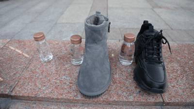 接着把1个瓶子原地不动暴露在风里,同时迅速地分别放进雪地靴和素湃老爹鞋的鞋内。