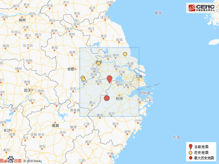 历史地震:根据中国地震台网速报目录,震中周边200公里内近5年来发生3级以上地震共6次,最大地震是2017年4月12日在浙江杭州市临安市发生的4.2级地震(距离本次震中113公里),历史地震分布如图。