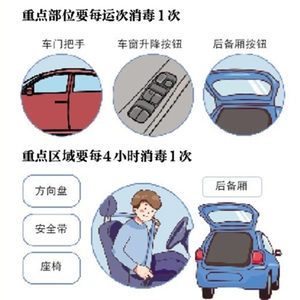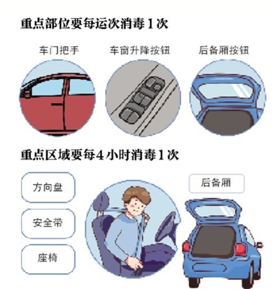 在车辆消毒方面,重点部位要每运次消毒1次,包括车门把手、车窗升降按钮、后备厢按钮等重点部位,驾驶员可随车携带使用醇类消毒湿巾对重点部位进行消毒。重点区域要每4小时消毒1次,包括司机方向盘、座套、安全带、座椅、脚垫、后备厢等。若出现人员发热等情况,应立即对接触区域及设施设备进行消毒。