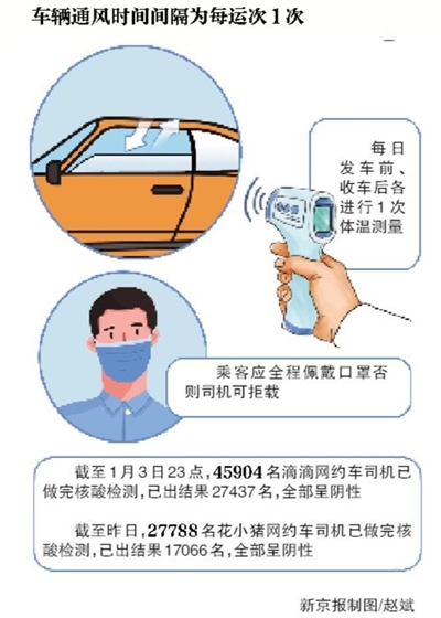 截至1月3日23点,45904名滴滴网约车司机已做完核酸检测,已出结果并上传核酸检测证明27437名,全部呈阴性结果;截至昨日,27788名花小猪网约车司机已做完核酸检测,已出结果并上传核酸检测证明17066名,全部呈阴性结果。