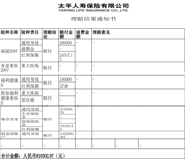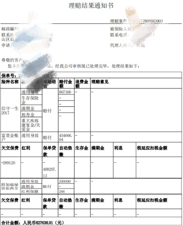 家属理赔申请后公司很快审核结案,共计赔付客户身故保险金198万余元,因涉及保单贷款清偿,本次实际到账金额为81.6万余元,也算给客户家属哪怕一点点的安慰。