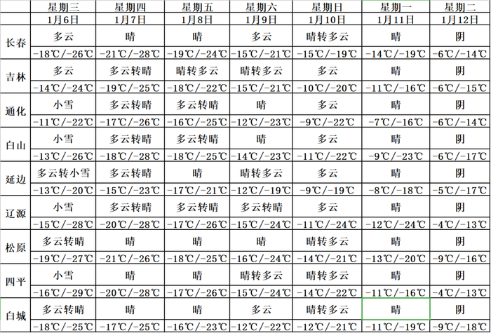 5日夜间吉林省大部分地区最低气温为-24~-21℃;6日白天通化地区最高气温为-11℃左右,其他大部分地区-18~-13℃,长春市5日夜间最低气温:-22℃,6日白天最高气温:-18℃。