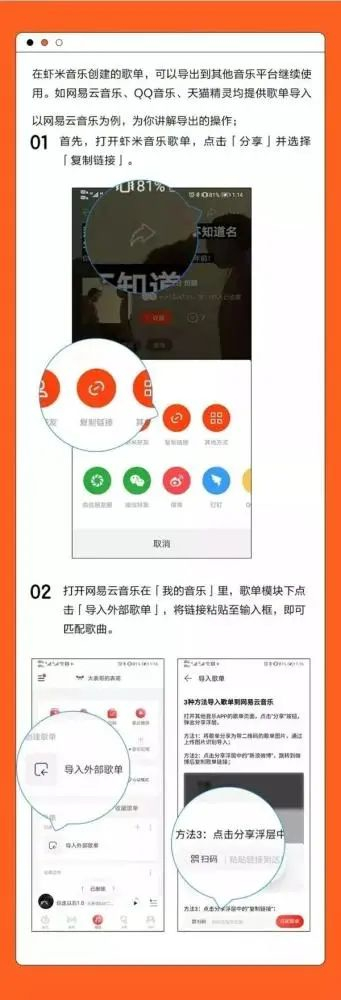 在虾米音乐主页上,我们设置了歌单转移的具体方法,用户创建或收藏的歌单可以通过复制链接的形式,在其他音乐平台继续播放。已经付费购买的数字专辑,可以下载到本地电脑/手机中继续使用;