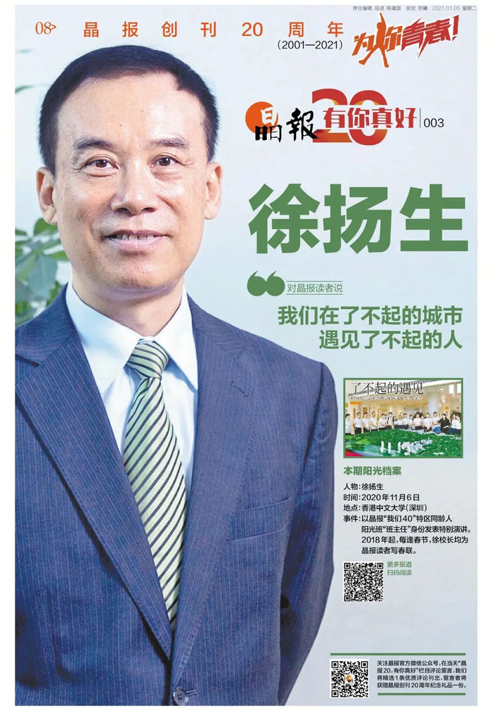 2020年时值深圳经济特区建立40周年。晶报从上千人海选中组建“我们40”特区同龄人"阳光班”,徐扬生教授欣然接受邀请,出任阳光班“班主任”。8月22日,“我们40”特区同龄人阳光班成立时,徐扬生送来了视频祝福。11月6日,“我们40”特区同龄人阳光班集体造访香港中文大学(深圳),徐扬生现场发表了题为“人生就是一次了不起的遇见”特别演讲,鼓励年轻人勇于承担责任,为社会多做贡献。