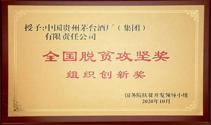 10月17日,2020年全国脱贫攻坚奖表彰大会在京举行,对2020年全国脱贫攻坚工作做出突出贡献的组织和个人进行表彰。茅台集团荣获“2020年全国脱贫攻坚组织创新奖”。表彰会旨在树立脱贫攻坚先进典型,讲好扶贫脱贫故事,展现脱贫攻坚伟大成就,引领社会风尚,弘扬社会主义核心价值观,鼓励全社会进一步行动起来,激励贫困地区广大干部群众进一步行动起来,万众一心,只争朝夕,不负韶华,咬定目标不动摇,一鼓作气、乘势而上,坚决打赢脱贫攻坚战。