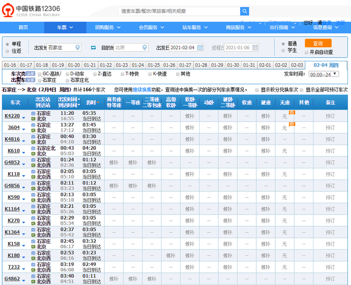 1月6日起至2月4日,石家庄、邯郸、邢台等地进京的所有高铁和普速列车车票均已无法购买。