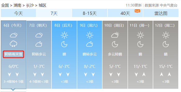 省气象台预报,6日下午至7日,受较强冷空气影响,省内自北向南有一次低温雨雪、风力加大过程,10日,湘南还有一次弱雨雪过程。