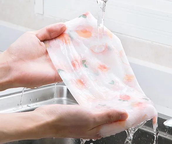 而这款洗碗抹布有一个大亮点!它自带洗洁精,抹布纸中添加了定量的洗洁精。