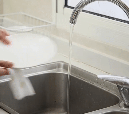 洗好的盘子放在水龙头下一冲就干净,方便省事。