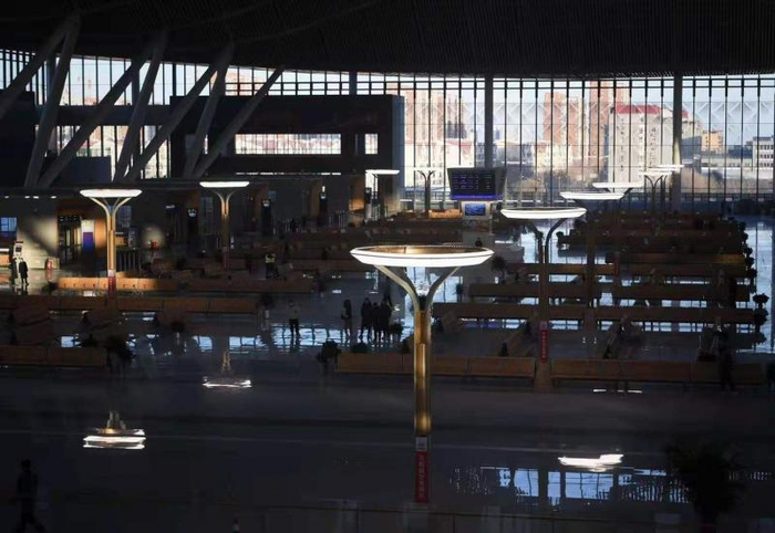 走进北京朝阳站,站内各项准备工作进入收尾阶段。车站分为三层,1万多平米的高架候车大厅,开通初期最多可容纳5000人同时候车。候车大厅的布置大气恢弘,14个出站口之间的14台落地灯特别的显眼,中铁设计集团北京朝阳站项目总工程师王青衣介绍,落地灯的设计该站的一大亮点,这种设计可以将本来设在屋顶的光源降低,大大降低了能耗又便于灯具的维护。