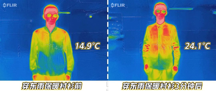 也就是说,穿着东雨冬季保暖衬衫比穿着衬衫加毛衣三分钟要多暖8.5℃!这保暖效果也是没谁了!